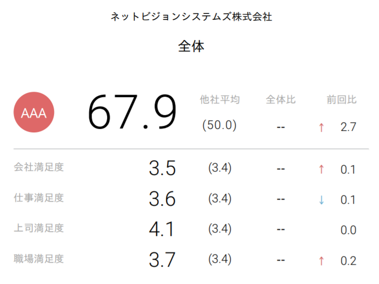 つまり、NVSは従業員満足度の偏差値が67.9なんです!!!(何とも嬉しい結果…(´;ω;`))
